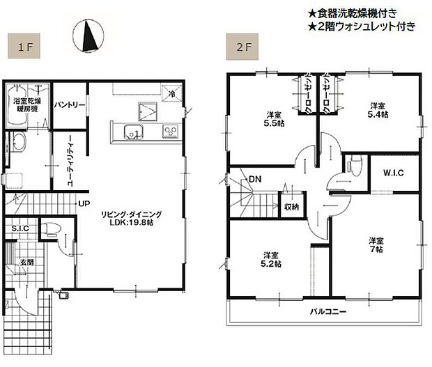 | 間取り | 4LDK(SIC、WIC、ユーティリティー、パントリー) 間取り内訳:リビングダイニングキッチン 19.8帖(1階)・洋室 5.2帖(2階)・洋室 5.5帖(2階)・洋室 5.4帖(2階)・洋室 7帖(2階) |