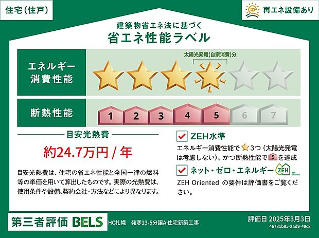 星マークの数が多いほどエネルギー消費性能が高いことを示しています。再エネ設備のない住宅は★0~★4の5段階評価、再エネ設備がある住宅は★0~★6の7段階評価となります。