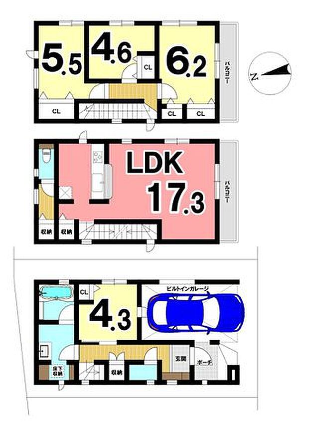 ■ビルトインガレージタイプ、三階建の4LDK■北側、南側の両面道路■システムキッチンは食洗器・浄水器付き■大型浴室TV■リネン棚、可動式棚のパントリーなど収納充実■玄関カードキーまたはタグキー