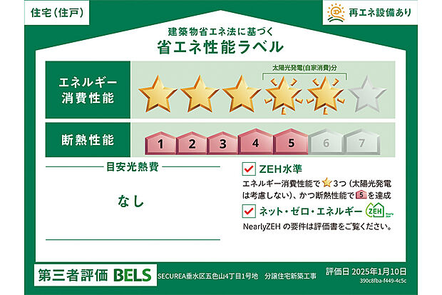 - 星マークの数が多いほどエネルギー消費性能が高いことを示しています。再エネ設備のない住宅は★0~★4の5段階評価、再エネ設備がある住宅は★0~★6の7段階評価となります。