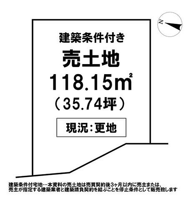 • 「建築条件付き土地」とは、一定期間内(概ね3ヶ月程度)に特定の建設会社と建築請負契約を結ぶことを 条件にしている宅地のことです。
