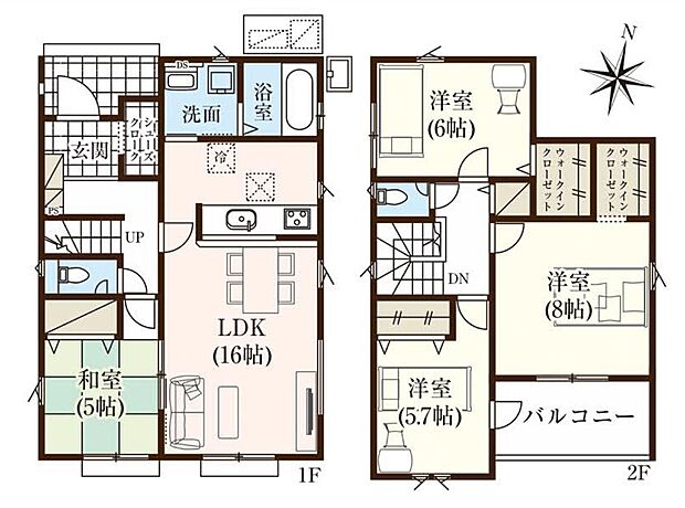 | 間取り | 4LDK 間取り内訳:リビングダイニングキッチン 16帖(1階)・和室 5畳(1階)・洋室 5.7帖(2階)・洋室 6帖(2階)・洋室 8帖(2階) |