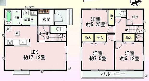 | 間取り | 3SLDK 間取り内訳:リビングダイニングキッチン 17.1帖(1階)・洋室 7.5帖(2階)・洋室 6.1帖(2階)・洋室 5.2帖(2階)・収納 2帖(2階) |