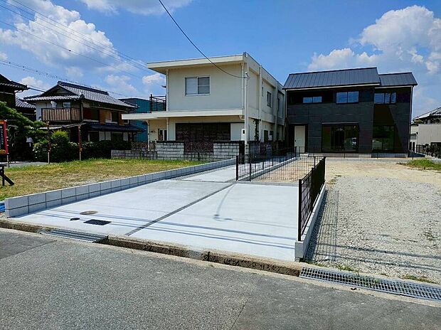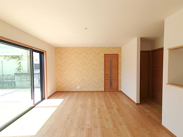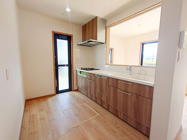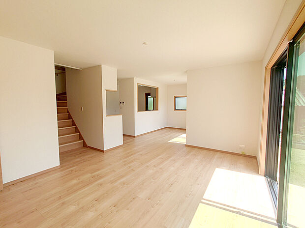 ●敷地面積195.57m2の平坦地。3LDKでゆとりのあるプランです。南側に「約52m2の庭スペース」があり陽当たりが良いのも嬉しいポイント!前面道路の幅員は約6.0mで駐車もしやすくなっております。 ●20帖以上あるLDKは南向きで陽当たりが良く開放感のある空間。広さに余裕があるため大型のソファやダイニングテーブルを置いても圧迫感がなく自由にレイアウトを楽しむことができます! ●キッチンからリビングを見渡すことができ、会話を楽しみながら料理をすることができます。キッチンのすぐ隣にはパントリーと家事カウンターが設けられており家事効率がUPします。