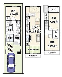 | 間取り | 2SLDK 間取り内訳:収納 5.2帖(1階)・リビングダイニングキッチン 18.5帖(2階)・洋室 6帖(3階)・洋室 6帖(3階) |