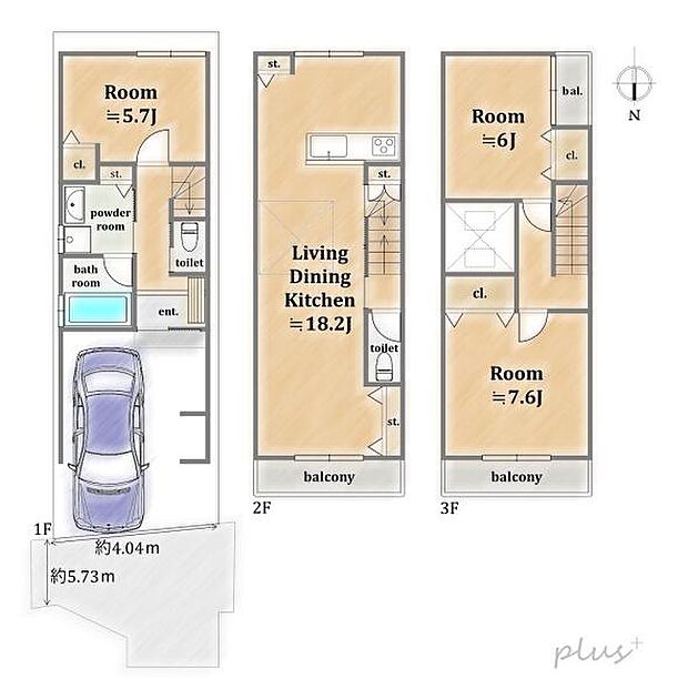 | 間取り | 3LDK 間取り内訳:洋室 5.7帖(1階)・リビングダイニングキッチン 18.2帖(2階)・洋室 7.6帖(3階)・洋室 6帖(3階) |