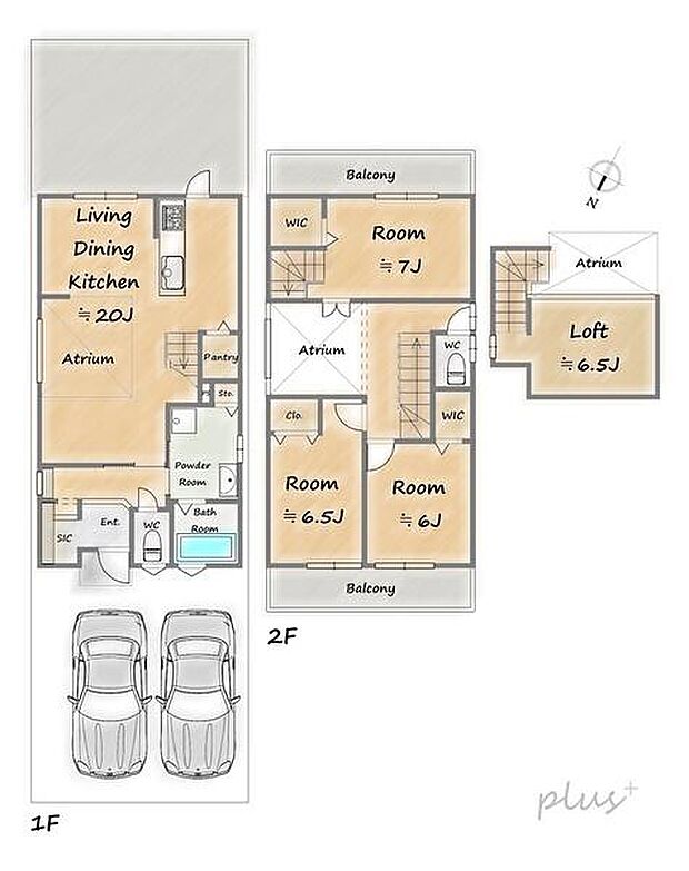 間取り内訳:リビングダイニングキッチン 20帖(1階)・和室 7畳(2階)・洋室 6.5帖(2階)・洋室 6帖(2階)