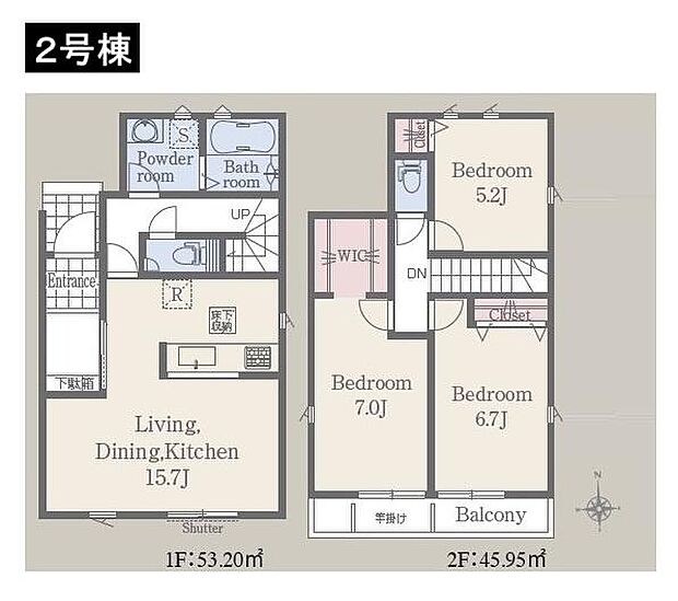 | 間取り | 3LDK 間取り内訳:リビングダイニングキッチン 15.7帖(1階)・洋室 7帖(2階)・洋室 6.7帖(2階)・洋室 5.2帖(2階) |