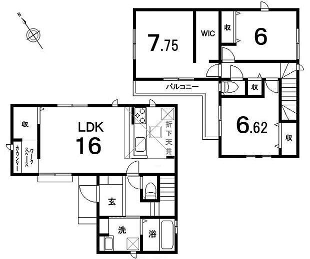 間取り内訳:リビングダイニングキッチン 16帖(1階)・洋室 7.7帖(2階)・洋室 6.6帖(2階)・洋室 6帖(2階)