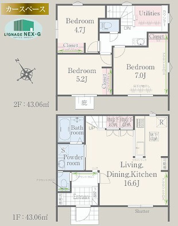| 間取り | 3LDK(カウンター付きユーティリティーあり) 間取り内訳:リビングダイニングキッチン 16.6帖・洋室 7帖・洋室 5.2帖・洋室 4.7帖 |