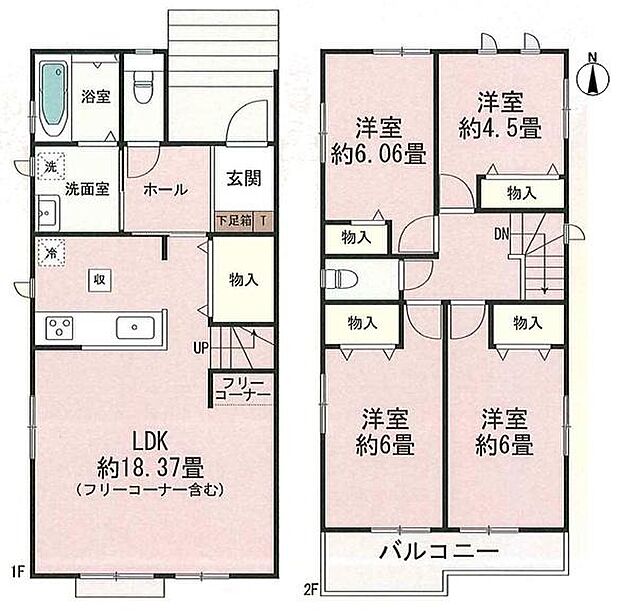 | 間取り | 4LDK 間取り内訳:リビングダイニングキッチン 18.3帖(1階)・洋室 6帖(2階)・洋室 6帖(2階)・洋室 6帖(2階)・洋室 4.5帖(2階) |