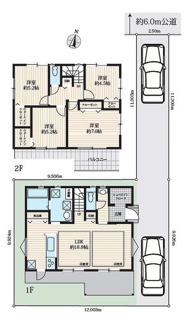 | 間取り | 4LDK 間取り内訳:洋室 7.6帖(2階)・洋室 5.2帖(2階)・洋室 5.2帖(2階)・洋室 4.5帖(2階)・リビングダイニングキッチン 18.8帖(1階) |