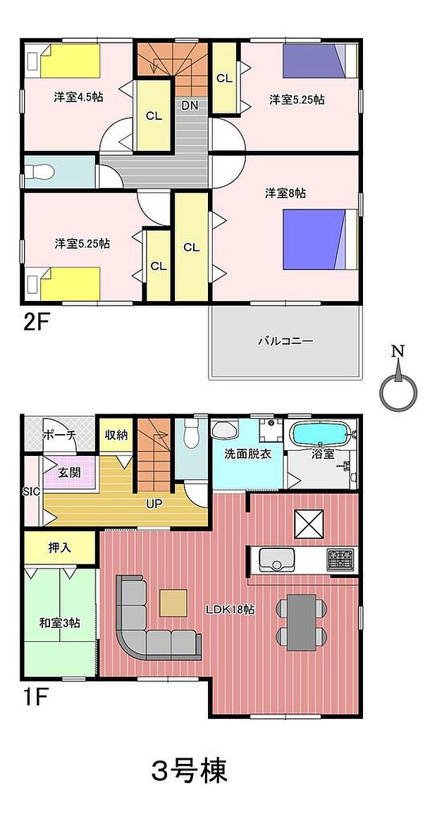 | 間取り | 5LDK 間取り内訳:リビングダイニングキッチン 18帖(1階)・和室 3畳(1階)・洋室 4.5帖(2階)・洋室 5.2帖(2階)・洋室 5.2帖(2階)・洋室 8帖(2階) |