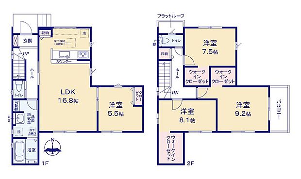 | 間取り | 4LDK 間取り内訳:洋室 9.2帖(2階)・洋室 8.1帖(2階)・洋室 7.5帖(2階)・洋室 5.5帖(1階)・リビングダイニングキッチン 16.8帖(1階) |
