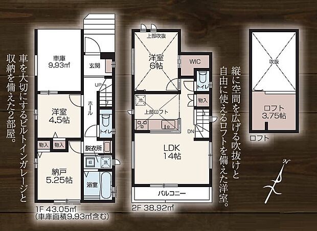 | 間取り | 2SLDK 間取り内訳:リビングダイニングキッチン 14帖(2階)・洋室 6帖(2階)・洋室 4.5帖(1階)・収納 5.2帖(1階) |