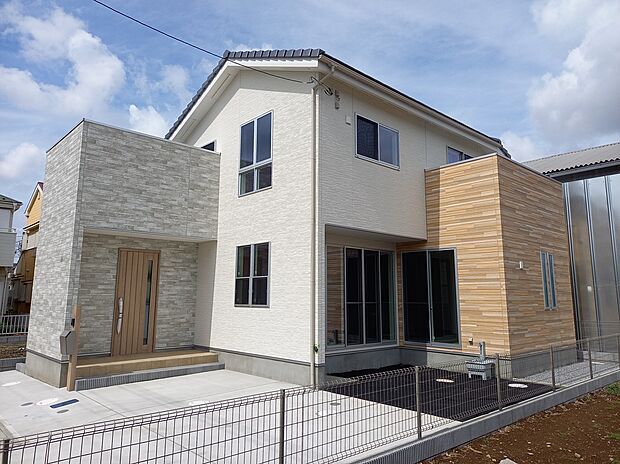 白をベースに木目と石目のアクセントカラーが目を引くナチュラルデザイン。瓦葺きの切妻屋根で、落ち着いた和のテイストをプラス。