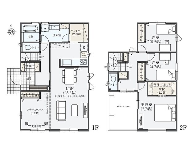 | 間取り | 3LDK 間取り内訳:リビングダイニングキッチン 25.2帖(1階)・洋室 7.7帖(2階)・洋室 5.2帖(2階)・洋室 4.7帖(2階) |