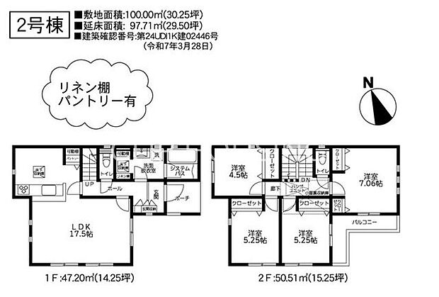 | 間取り | 4LDK 間取り内訳:リビングダイニングキッチン 17.5帖(1階)・洋室 7帖(2階)・洋室 5.2帖(2階)・洋室 5.2帖(2階)・洋室 4.5帖(2階) |