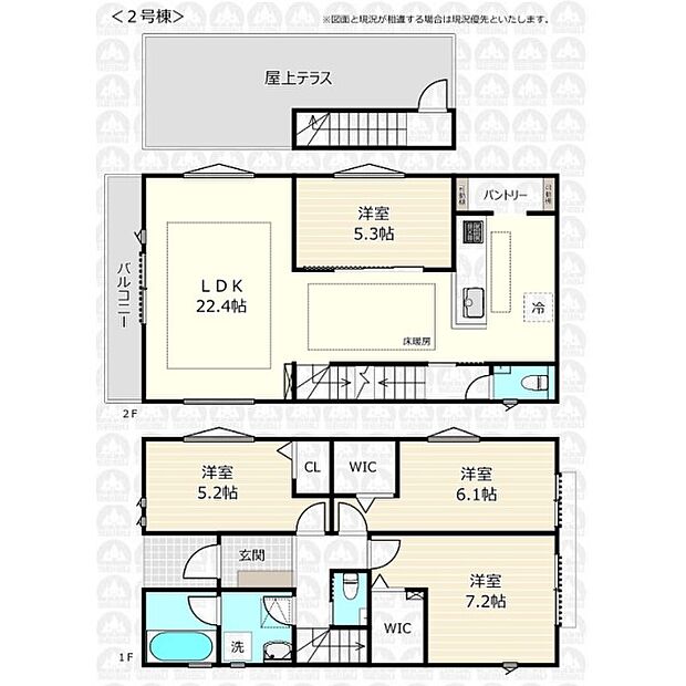 22帖以上のゆとりある広さのLDK!/空が広がる屋上テラス/全室ゆったり5帖以上/WIC2カ所/床暖房/食洗機