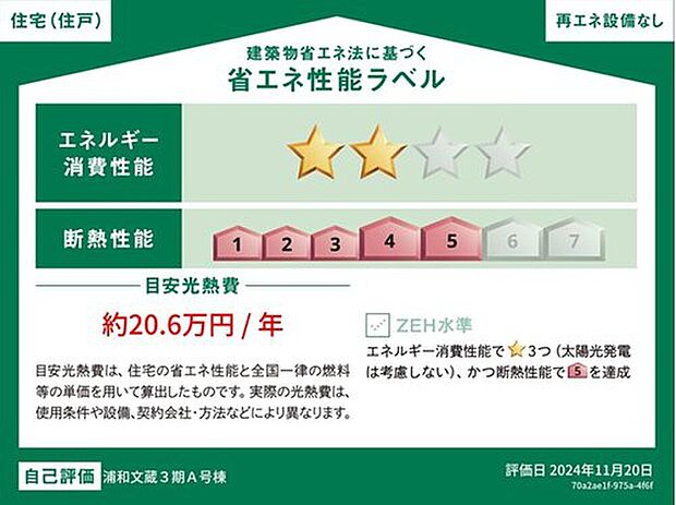 - 星マークの数が多いほどエネルギー消費性能が高いことを示しています。再エネ設備のない住宅は★0~★4の5段階評価、再エネ設備がある住宅は★0~★6の7段階評価となります。