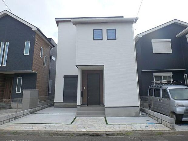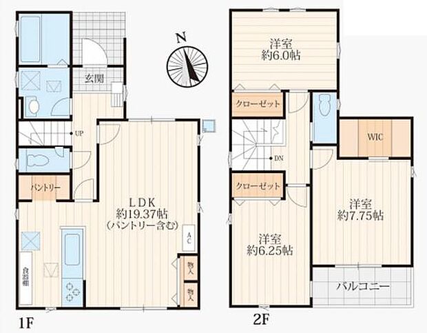 2階建ての3LDK。収納充実(キッチンにパントリーと食器棚・リビングに物入・主寝室にWIC等)