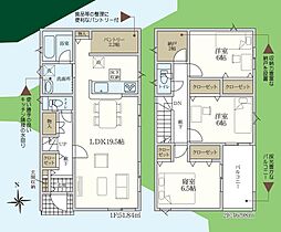 間取り内訳:リビングダイニングキッチン 16.4帖(1階)・洋室 9帖(2階)・洋室 6帖(2階)・収納 2.2帖(2階)