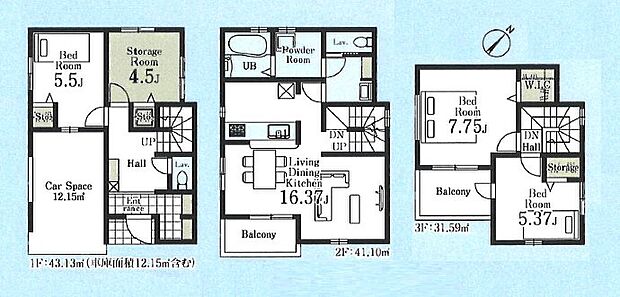 | 間取り | 3SLDK 間取り内訳:洋室 7.7帖(3階)・洋室 5.3帖(3階)・リビングダイニングキッチン 16.3帖(2階)・洋室 5.5帖(1階)・収納 4.5帖(1階) |