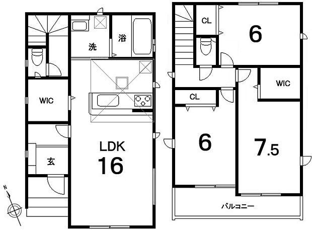 | 間取り | 3LDK 間取り内訳:リビングダイニングキッチン 16帖(1階)・洋室 7.5帖(2階)・洋室 6帖(2階)x2 |