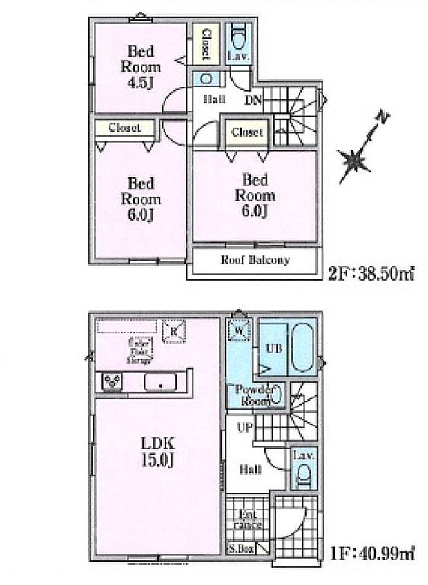 | 間取り | 3LDK 間取り内訳:洋室 6帖(2階)・洋室 6帖(2階)・洋室 4.5帖(2階)・リビングダイニングキッチン 15帖(1階) |