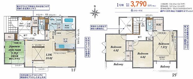 間取り内訳:和室 5.2畳(1階)・リビングダイニングキッチン 18帖(1階)・洋室 7.8帖(2階)・洋室 6帖(2階)・洋室 6帖(2階)