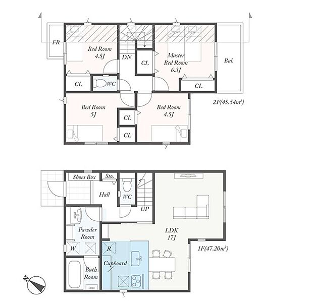 | 間取り | 4LDK 間取り内訳:リビングダイニングキッチン 17帖(1階)・洋室 4.5帖(2階)・洋室 6.3帖(2階)・洋室 5帖(2階)・洋室 4.5帖(2階) |