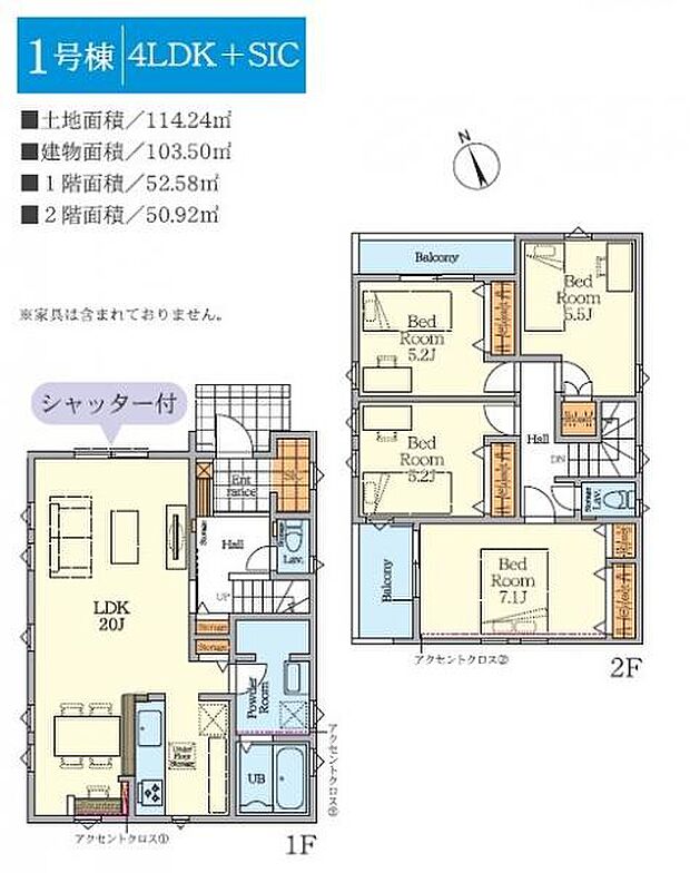 | 間取り | 4LDK 間取り内訳:リビングダイニングキッチン 20帖(1階)・洋室 7.1帖(2階)・洋室 5.5帖(2階)・洋室 5.2帖(2階)x2 |