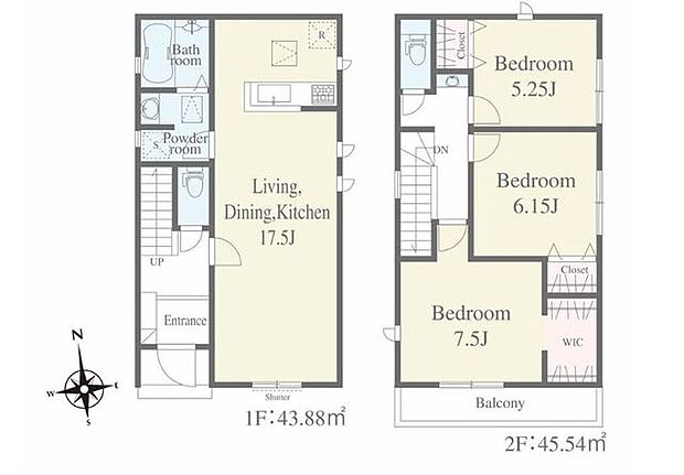 間取り内訳:リビングダイニングキッチン 17帖(1階)・洋室 5.2帖(2階)・洋室 5.2帖(2階)・洋室 7.8帖(2階)