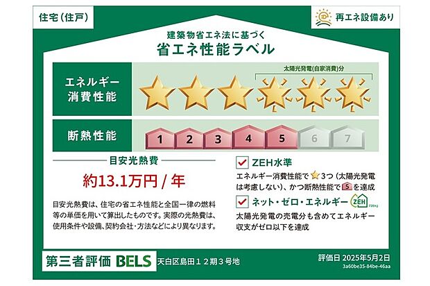 - 星マークの数が多いほどエネルギー消費性能が高いことを示しています。再エネ設備のない住宅は★0~★4の5段階評価、再エネ設備がある住宅は★0~★6の7段階評価となります。