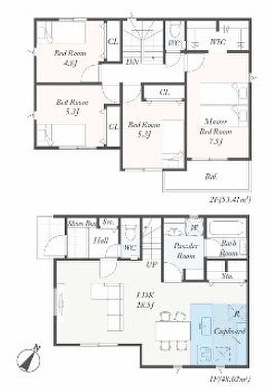 | 間取り | 4LDK 間取り内訳:リビングダイニングキッチン 18.5帖(1階)・洋室 7.5帖(2階)・洋室 5.3帖(2階)x2・洋室 4.8帖(2階) |