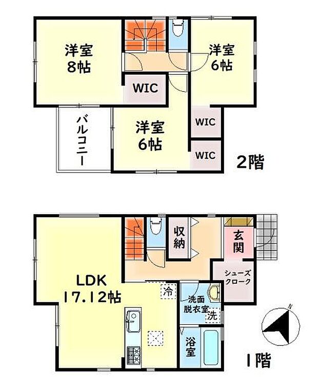 | 間取り | 3LDK(+WIC) 間取り内訳:リビングダイニングキッチン 17.1帖(1階)・洋室 8帖(2階)・洋室 6帖(2階)・洋室 6帖(2階) |