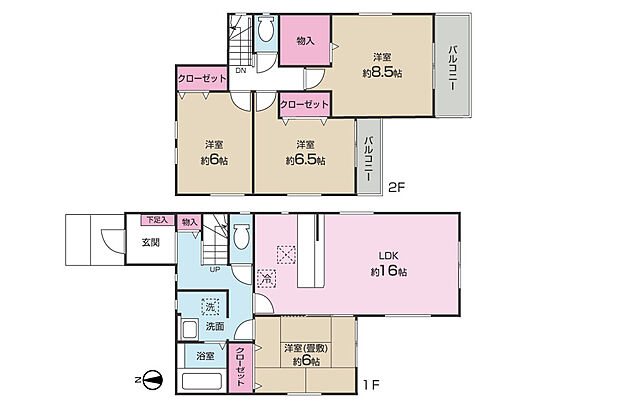 | 間取り | 4LDK 間取り内訳:リビングダイニングキッチン 16帖(1階)・和室 6畳(2階)・洋室 8.5帖(2階)・洋室 6.5帖(2階)・洋室 6帖(2階) |