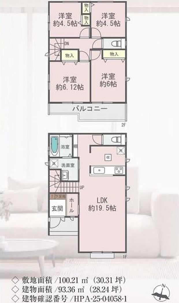 | 間取り | 4LDK 間取り内訳:リビングダイニングキッチン 19.5帖(1階)・洋室 6.1帖(2階)・洋室 6帖(2階)・洋室 4.5帖(2階)x2 |