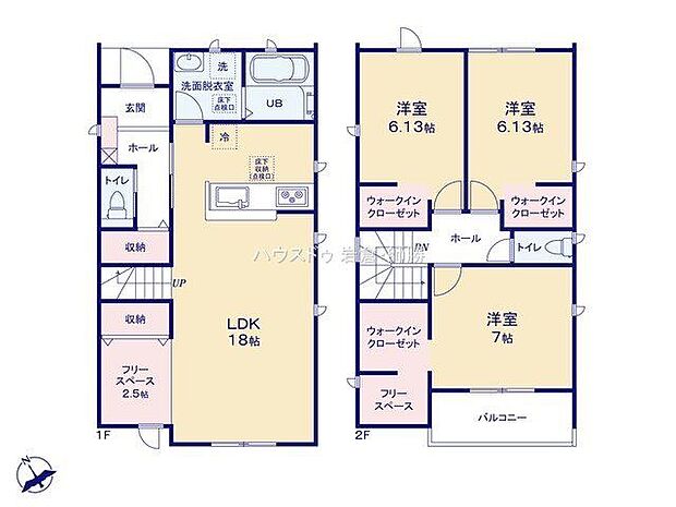 間取り内訳:リビングダイニングキッチン 18帖(1階)・洋室 7帖(2階)・洋室 6.1帖(2階)・洋室 6.1帖(2階)