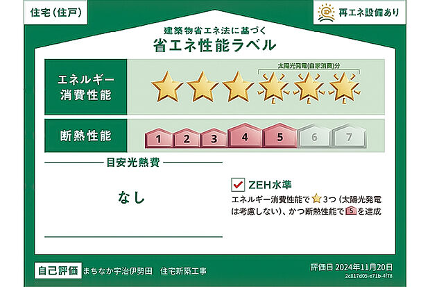 - 星マークの数が多いほどエネルギー消費性能が高いことを示しています。再エネ設備のない住宅は★0~★4の5段階評価、再エネ設備がある住宅は★0~★6の7段階評価となります。