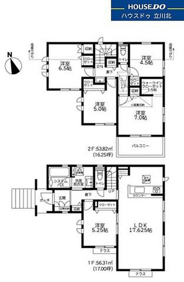 間取り内訳:リビングダイニングキッチン 17.6帖(1階)・洋室 5.2帖(1階)・洋室 7帖(2階)・洋室 5帖(2階)・洋室 6.5帖(2階)・洋室 4.5帖(2階)