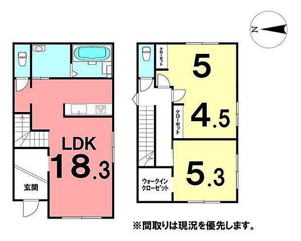 間取り内訳:リビングダイニングキッチン 18.3帖(1階)・洋室 5.3帖(2階)・洋室 4.5帖(2階)・洋室 5帖(2階)