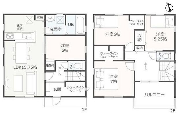 間取り内訳:リビングダイニングキッチン 15.7帖(1階)・洋室 5帖(1階)・洋室 7帖(2階)・洋室 6帖(2階)・洋室 5.2帖(2階)
