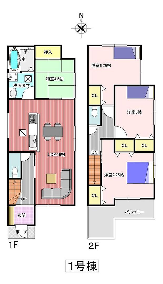 | 間取り | 4LDK 間取り内訳:リビングダイニングキッチン 16帖(1階)・和室 4.5畳(1階)・洋室 6帖(2階)・洋室 6.8帖(2階)・洋室 7.8帖(2階) |