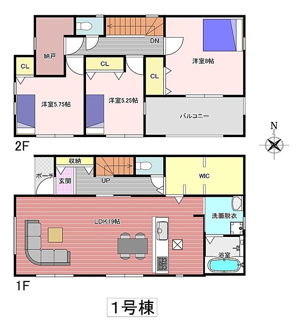 間取り内訳:リビングダイニングキッチン 19帖(1階)・洋室 5.2帖(2階)・洋室 5.7帖(2階)・洋室 8帖(2階)