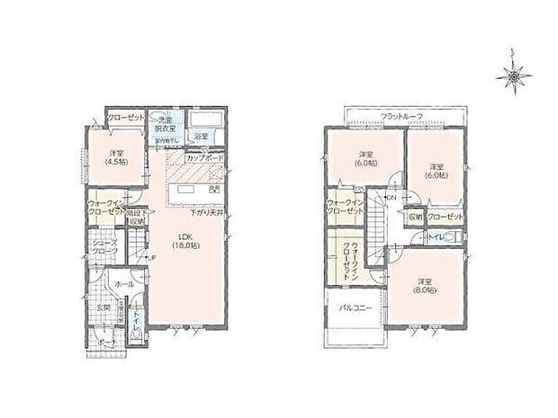 | 間取り | 4LDK 間取り内訳:リビングダイニングキッチン 18帖(1階)・洋室 4.5帖(1階)・洋室 8帖(2階)・洋室 6帖(2階)・洋室 6帖(2階) |