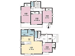 | 間取り | 4LDK 間取り内訳:リビングダイニングキッチン 16帖(1階)・洋室 4.5帖(1階)・洋室 7帖(2階)・洋室 6帖(2階)・洋室 5.2帖(2階) |