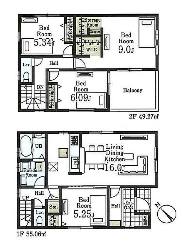 | 間取り | 4SLDK 間取り内訳:洋室 9帖(2階)・洋室 6帖(2階)・洋室 5.3帖(2階)・洋室 5.2帖(1階)・リビングダイニングキッチン 16帖(1階) |