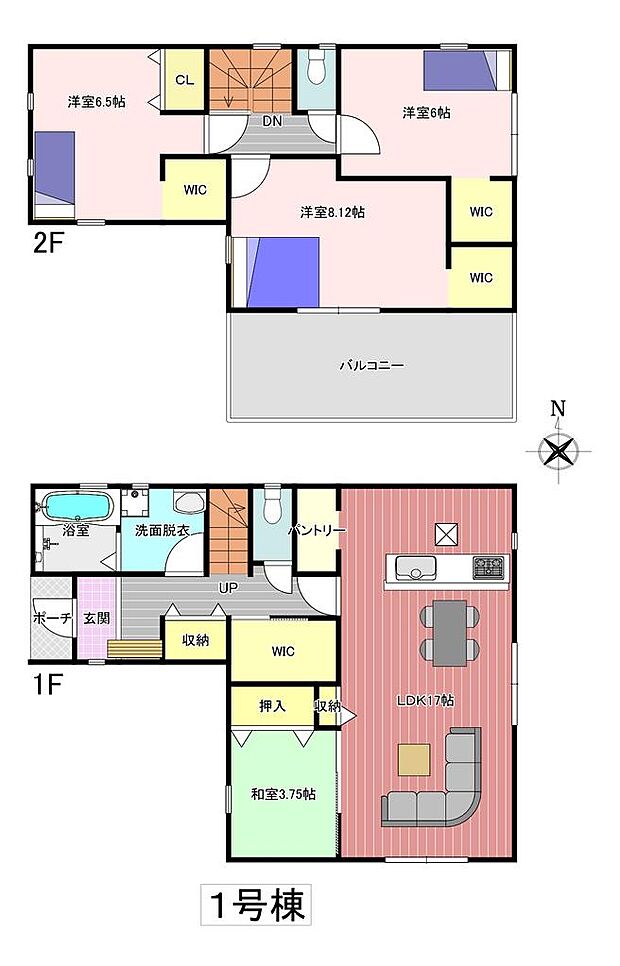 間取り内訳:リビングダイニングキッチン 17帖(1階)・和室 3.7畳(1階)・洋室 6帖(2階)・洋室 6.5帖(2階)・洋室 8.1帖(2階)