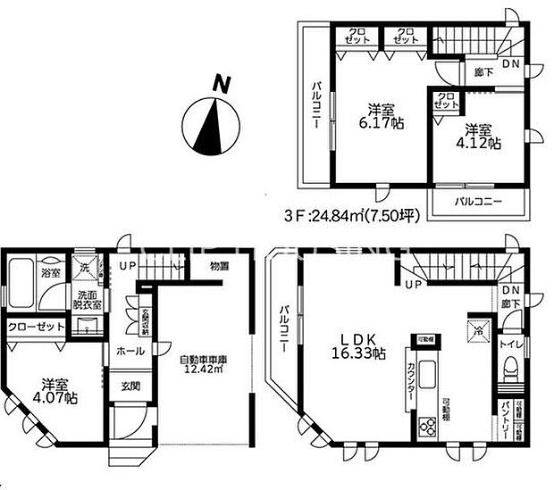 | 間取り | 3LDK 間取り内訳:リビングダイニングキッチン 16.3帖(2階)・洋室 6.1帖(3階)・洋室 4.1帖(3階)・洋室 4.7帖(1階) |